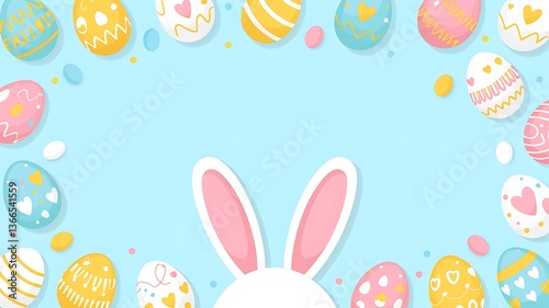 Easter Party Concept with Bunny Ears Colorful Easter Eggs Delicate Spring Flowers on a Pastel Blue Background with Copy Space for Festive Designs Greeting Cards and Holiday Invitations. Easter Holiday