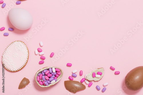 Easter pink background with eggs and flowers