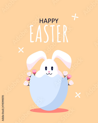 Easter postcard with Easter bunny sitting in egg with flowers. Postcard on orange background for the spring holiday. Unique design for spring banners and postcards
