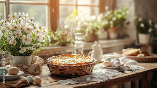Easter quiche on a rustic wooden table with spring flowers and eggs