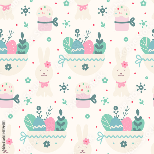 Easter seamless pattern with easter bunnies, eggs, cakes, flowers. Suitable for Easter cards, wallpaper, paper, fabric, interior decor and others