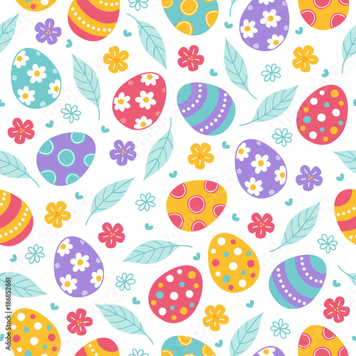 Easter seamless pattern with leaves, flowers and colorful eggs