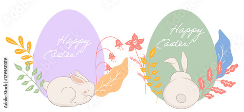 Easter set. Sleeping rabbit, golden egg, botanical decorations, soft pastel tones, warm seasonal greeting, peaceful holiday design, elegant nature-inspired composition, joyful spring scene