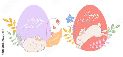 Easter set. Sleeping rabbit, lilac egg, warm botanical details, gentle pastel palette, peaceful seasonal greeting, nature-inspired holiday design, joyful festive theme, elegant spring composition