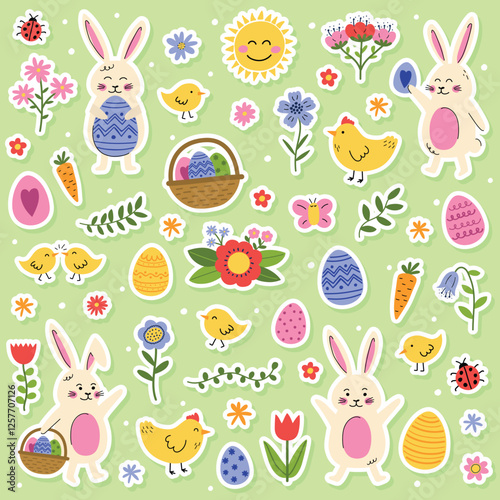 Easter sticker set with cute elements: bunny, chick, egg and flower. Cartoon style characters. Vector illustration