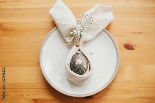 Easter table decorations. Stylish Easter brunch table setting with egg in easter bunny napkin. Modern natural dyed marble egg on napkin with bunny ears, flowers on simple plate.