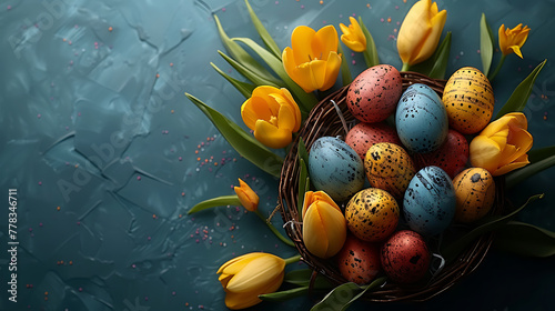 Easter template for greeting card, Easter background, Easter basket with colorful easter eggs and tulips, high resolution graphic source, 16:9, 1920*1080