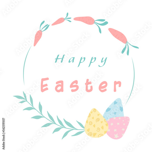 Easter wreath with easter eggs. Decorative doodle frame from Easter eggs with carrots and floral elements. Easter eggs with ornaments in circle shape. Easter greeting card.