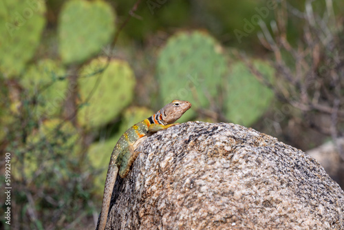 Eastern collared lizard, Crotaphytus collaris, basking in the sun on a rock, in the Sonoran Desert with prickly pear cactus in the background in the Catalina Mountains north of Tucson, Arizona, USA.