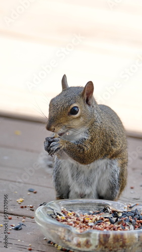 Eastern gray squirrel (Sciurus carolinensis) eating bird seed from a patio in Panama City, Florida, USA