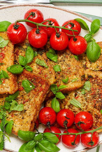 Easy Savory French Toast with Roasted Cherry Tomatoes and Basil..selective focus