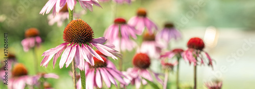 Echinacea Purpurea or Pink Coneflower in garden. Summer flower background. Selective focus. Horizontal banner