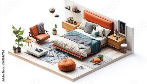 Eclectic bedroom Isometric 3D render displaying mixed furniture styles, artistically laid out in a floor plan on an isolated white background.