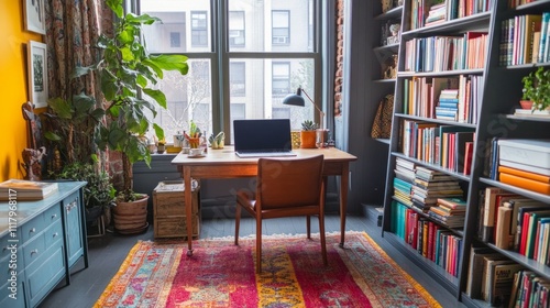 Eclectic home office with a laptop on the desk, vibrant books stacked neatly, and a bright rug adding character to the room