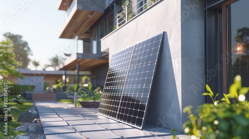 Eco friendly backyard with solar panels and garden generated with AI