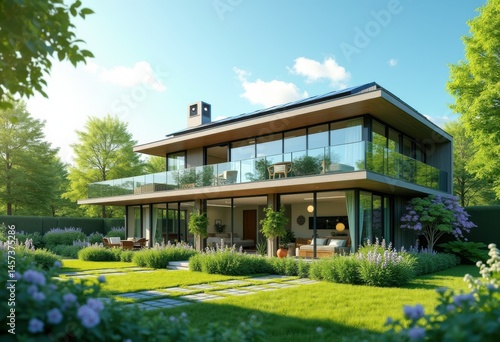eco friendly home rooftop solar panels sustainable renewable energy clean living environment emission reduction green house technology, photovoltaic