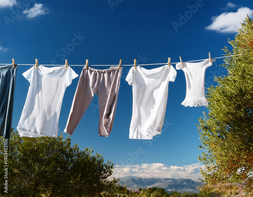eco friendly laundry drying on clothes line against a blue sky