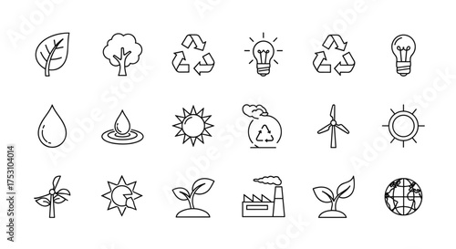 Eco friendly line icon set. Environment, sustainability and recycling concepts. Vector graphic resources for green energy, nature, water conservation, and pollution awareness.