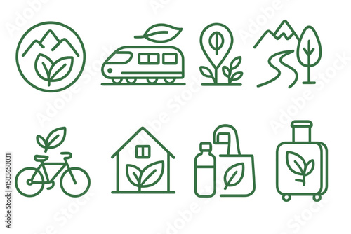 Eco Travel Icons. Line style icons of green travel: eco travel badge, train journey, local tour, hike path. bicycle rental, eco