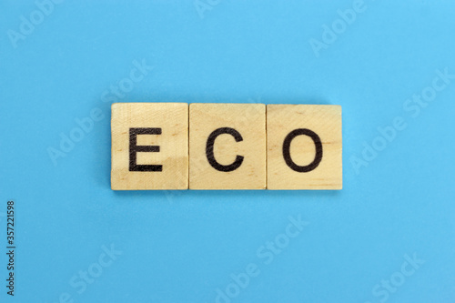 Eco word of wooden letters on a blue background