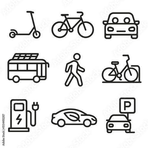 Eco-Commuting Icon Set. Outline icon set of sustainable commuting options: electric scooter, e-bike, car share vehicle, solar bus,