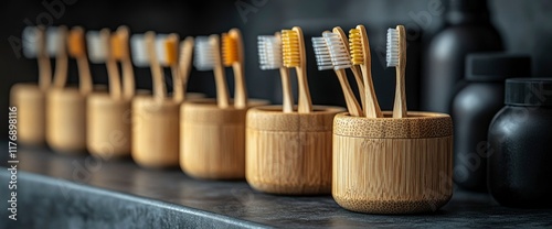 Eco-Friendly Bamboo Toothbrushes in Wooden Holders on Dark Shelf
