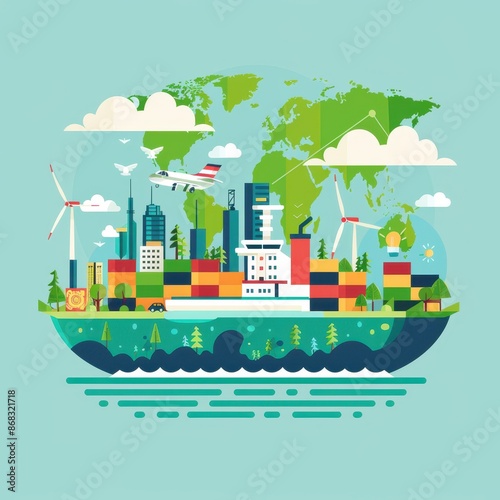 Eco-friendly city with wind turbines and buildings, showcasing sustainable living and green energy on a global scale.