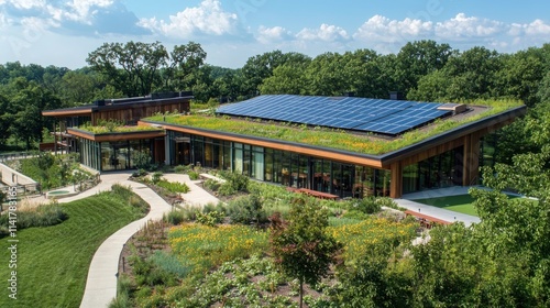 Eco-friendly community center featuring solar panels urban green space modern architecture sustainable design aerial view