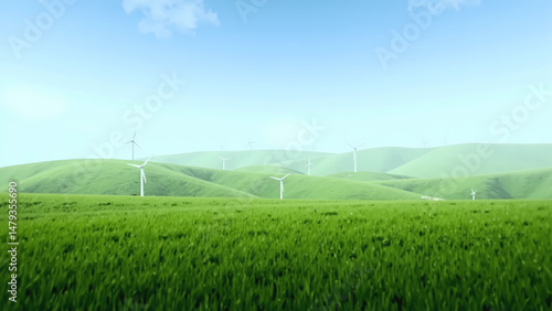 Eco-friendly energy concept: wind turbines in lush wheat field beneath blue sky.
