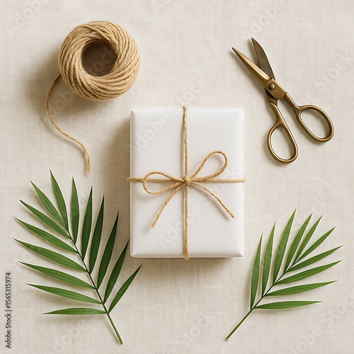 Eco-friendly gift wrapping with natural twine, palm leaves, and vintage scissors, sustainable present packaging for holidays, birthdays, and special occasions