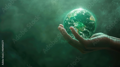 Eco-friendly hand holding digital globe with transparent holograms and green symbols. Capturing sustainability and innovation on a soft green background.