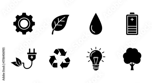 Eco-friendly icons set featuring nature, energy, and sustainability symbols in flat design