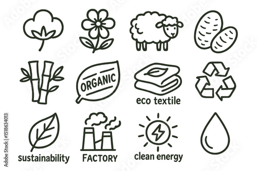 Eco-friendly icons: sustainability, organic, recycling, clean energy, textiles