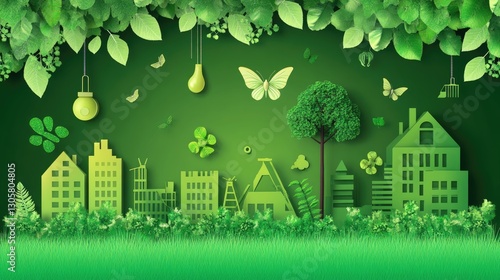 Eco-friendly industrial future with factories using green energy solutions, reducing emissions, and promoting sustainability.
