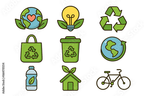 Eco-friendly living icons set with sustainability, recycling symbols, green energy, reusable bag, earth care, green home, water bottle, and bicycle illustrations for environmental awareness