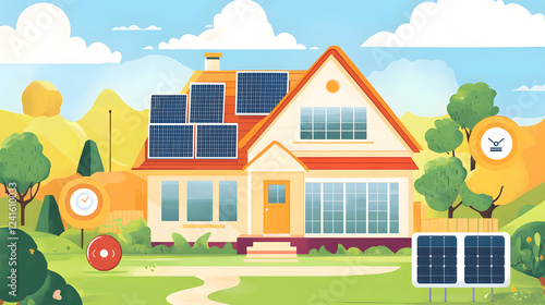 Eco-friendly modern smart home with solar panels and energy storage for sustainable living and reducing energy costs.Modern smart home with solar panels and battery storage, achieving energy self-suff