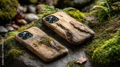 Eco-Friendly Phone Cases with Natural Wood Texture on Mossy Background