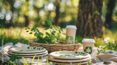 Eco-friendly picnic setup with biodegradable tableware in a natural park setting. Greenery and sunlight create a relaxing atmosphere.