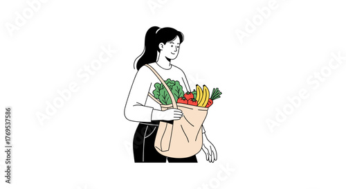 Eco-friendly shopping: woman with reusable bag full of fresh vegetables and fruits