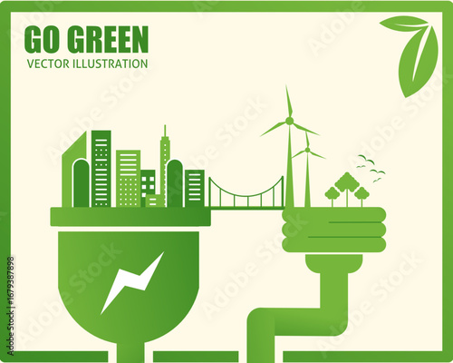 Eco-friendly vector illustration showing a sustainable city with renewable energy, wind turbines, trees, and green power promoting the concept of "Go Green."