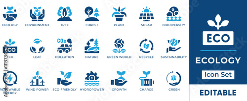 Ecology Icon Set. Features editable icons for environment symbols, nature, sustainability, eco-friendly, renewable energy, and more. Perfect for environmental, sustainability, and eco-friendly designs