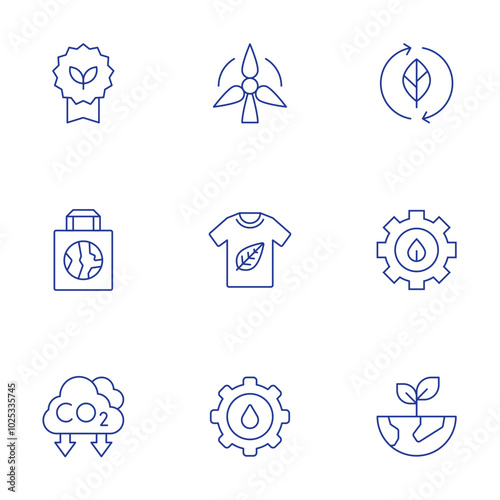 Ecology icons set. Thin Line style, editable stroke. eco, wind energy, water system, tshirt, carbon dioxide, eco bag, leaf, plant