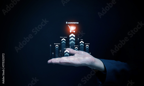 E-commerce growth concept with digital shopping cart, rising business elements like order volume, marketplace, delivery, and payment, symbolizing online sales success.