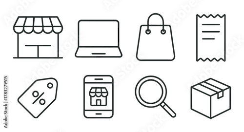 E-commerce icons: storefront, laptop, shopping, receipt, discount, mobile, search, parcel