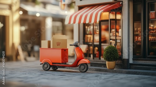 E-commerce idea featuring a delivery service via mobile app, with transportation by truck or scooter. 3D render.