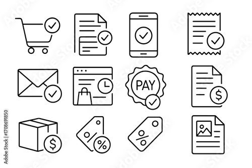 E-commerce Line Icons. Line style icons of e-commerce transactions: cart checkout icon, order confirmation with payment, digital