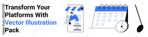 E-commerce store on mobile, hanging calendar, clock, measuring spoon. Ideal for e-commerce, scheduling, productivity, time management, planning online services flat landing page banner