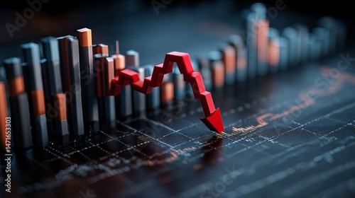 Economic crisis concept showing falling stock chart with global business and money symbols representing financial downturn and risk of bankruptcy
