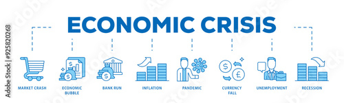Economic crisis icon infographic illustration concept with icon of recession, unemployment, inflation, currency fall, pandemic, bank run icon live stroke and easy to edit
