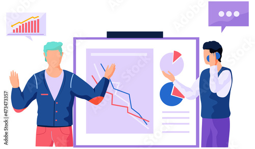 Economic problems, declining indicators of profit, financial decrease, business report concept. Men work with diagrams, statistical data analysis. Communication about bankruptcy, economic crisis